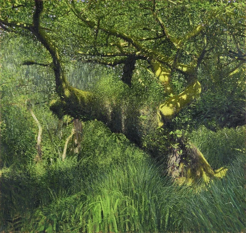 Andrew Gifford, Oak in Height of Spring, Wistman’s Wood, Dartmoor, 2024, oil on canvas, 190 x 200 cm. Credit: Courtesy of John Martin Gallery.